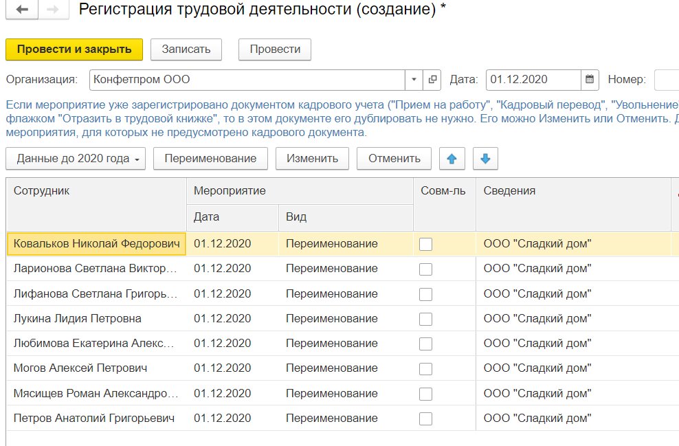 Отражение в СЗВ-ТД присвоения квалификации и переименования организации до 01.01.2020 в 1С ЗУП