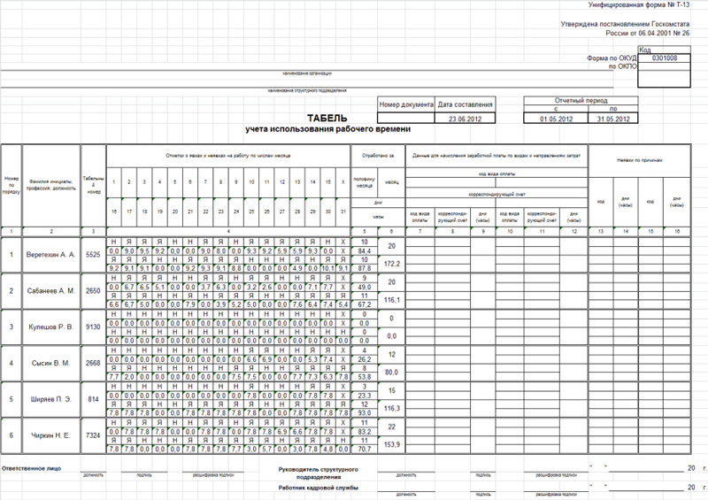 Заполнение табеля учета рабочего времени сотрудников 1С
