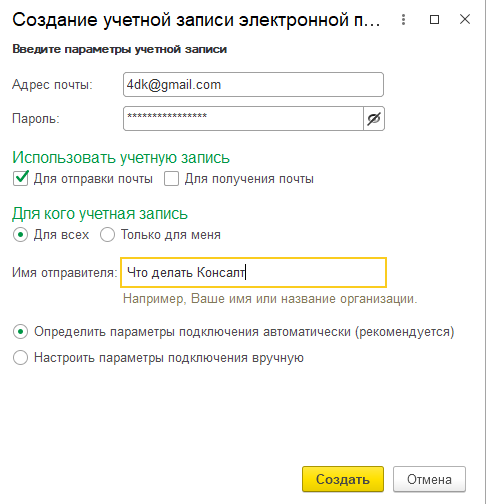 Учетные записи электронной почты (Создание) 1С:УНФ