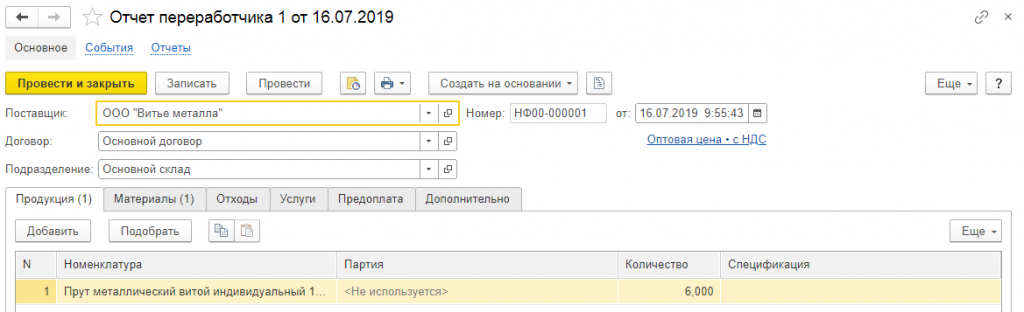 Передача в переработку - 1C:ERP 2.4 - 1С:Учебный центр №1