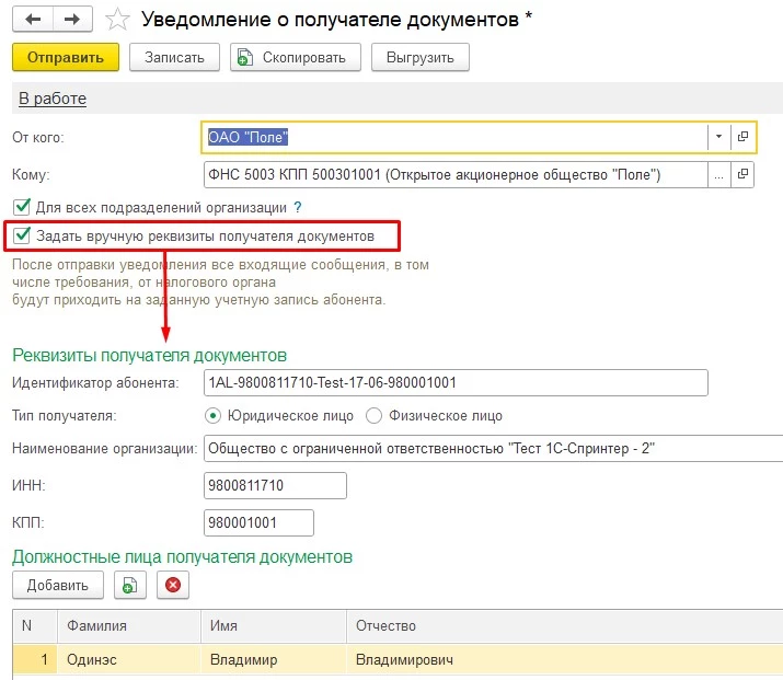 1С-Отчетность: Формирование и отправка уведомление о получателе документов 2.0