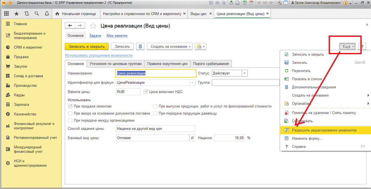 Курс 1С ERP Управление предприятием 2, Виды цен
