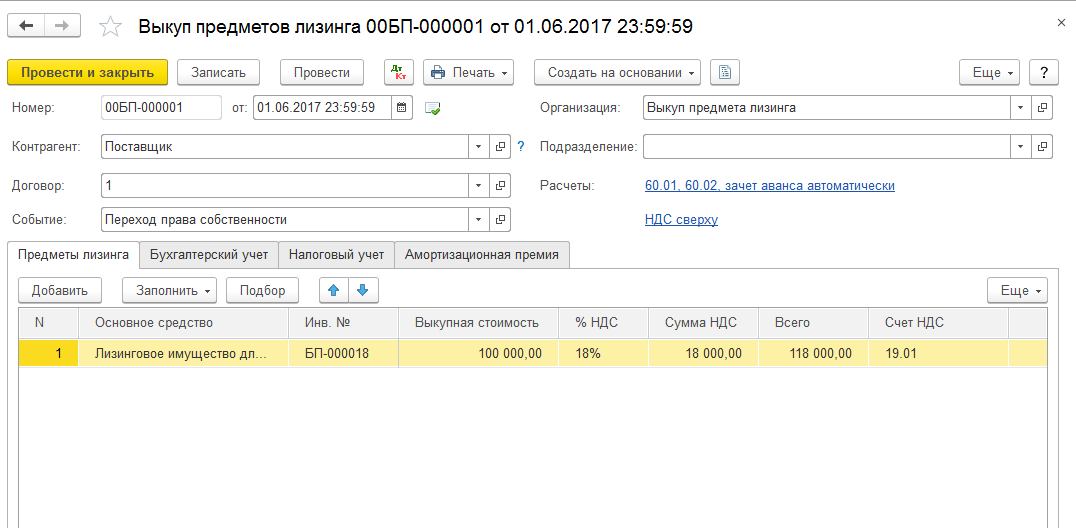 Выкуп предмета лизинга в 1С 8.3 у лизингополучателя