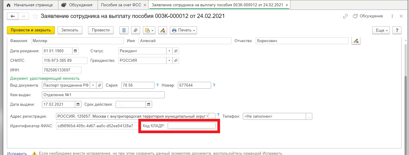 При изменении места жительства обновите код по кладр во всех соответствующих документах, включая больничные листы.