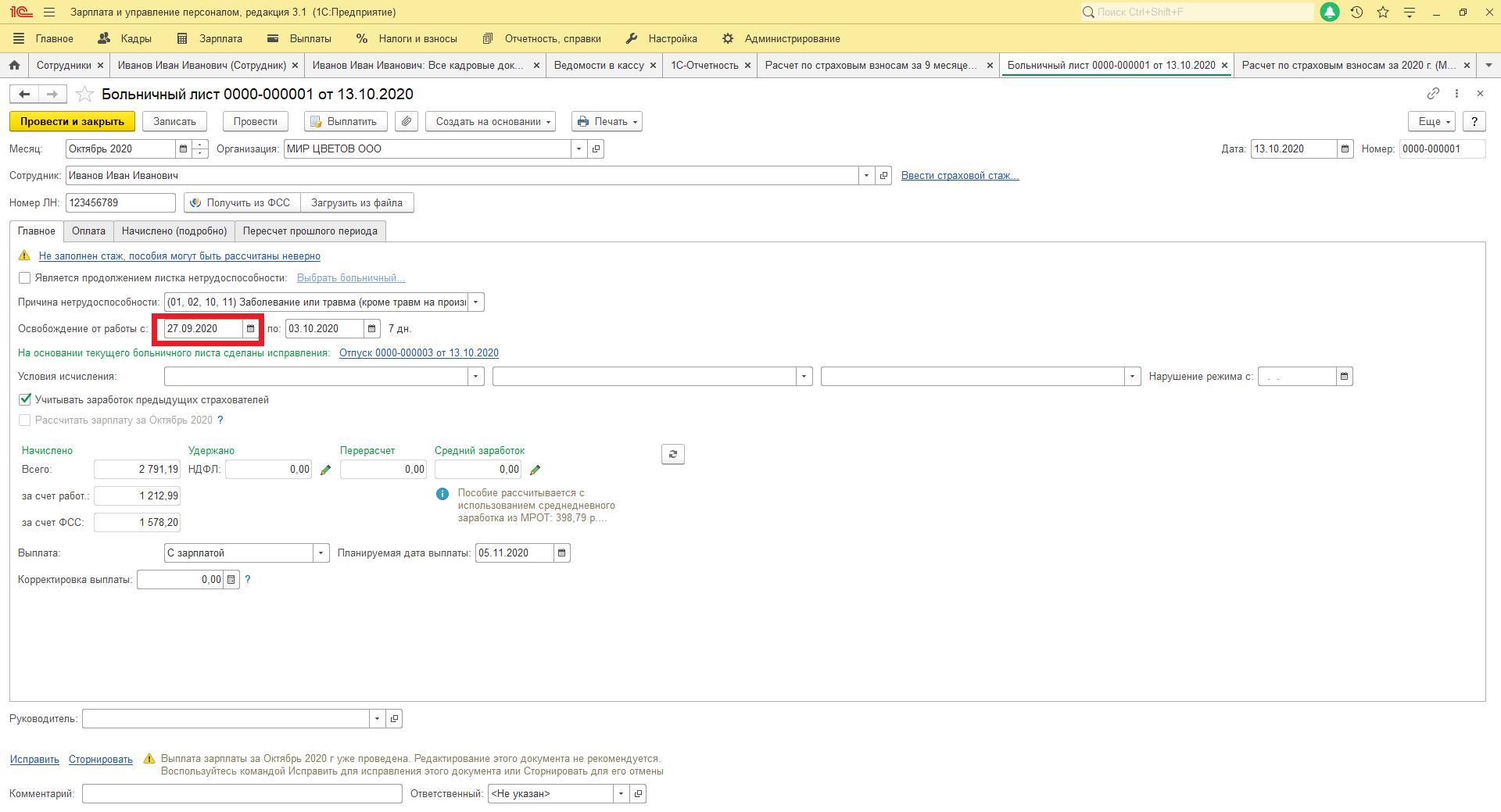 Начисление больничного в 1С Бухгалтерия 8.3
