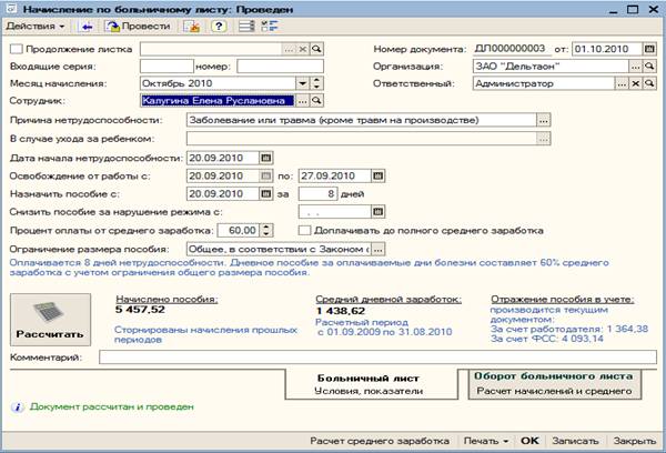 Начисление больничного листа