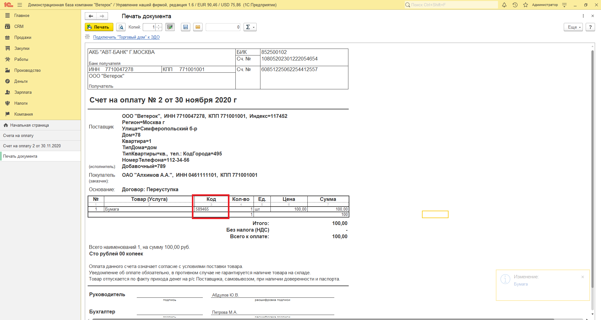 Счет договор в 1С
