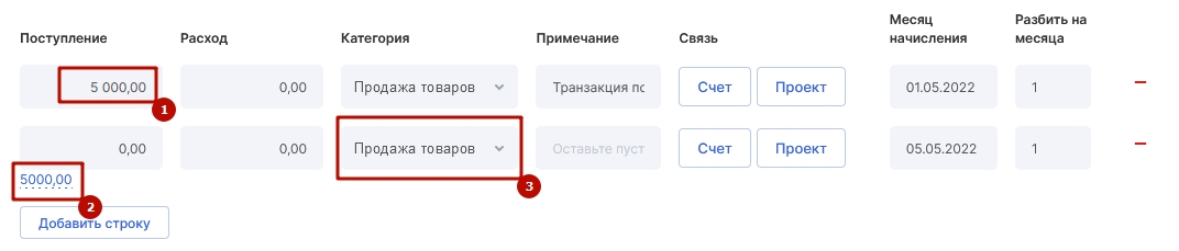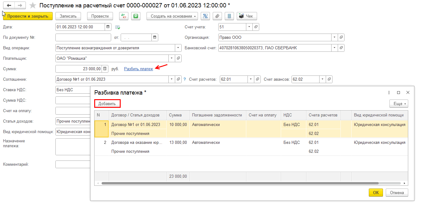 Проверьте правильность разбивки платежа на счета и сохраните изменения.