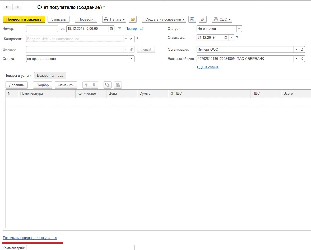 Проверьте правильность заполнения реквизитов покупателя перед созданием счета.